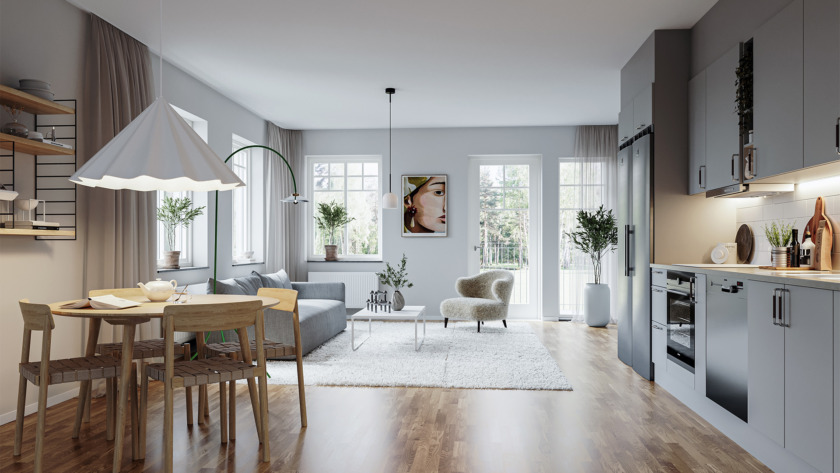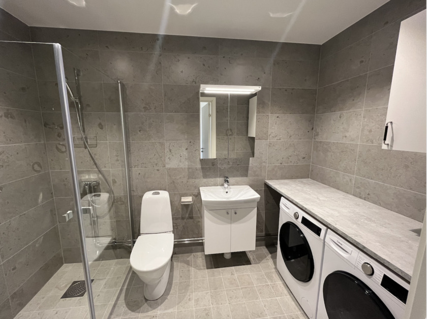 Bostäderna i Steninge Slottsby har en modern och öppen planlösning som skapar en luftig och social atmosfär. Köket är från Marbodal med eleganta grå skåpluckor i kulören ”Moln”, stilrena handtag och rostfria vitvaror från Cylinda. Badrummen är helkaklade med klinker från Bricmate, och de större bostäderna är utrustade med tvättmaskin och torktumlare eller kombimaskin. I hallen ligger praktisk klinker som tål blöta skor, och bostäderna har gott om förvaring i form av garderober och förråd/klädkammare.