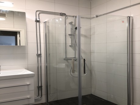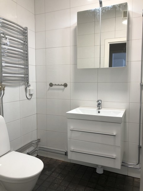 Bostaden erbjuder ett rymligt kök med plats för matgrupp och full maskinell utrustning, inklusive hel kyl och frys, inbyggd mikrovågsugn, varmluftsugn, induktionshäll och diskmaskin. Det stilrena badrummet är helkaklat och utrustat med dusch med glasväggar, golvvärme, handdukstork och tvättmaskin – allt för att förenkla vardagen.