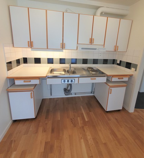 Ljus och stor hall med hatthylla. Luftigt och charmigt handikappanpassat kök med vita skåpsluckor. Badrummet är fräscht och lätt städat med kakel och plastmatta. Rummen är nymålade med vita och grå väggar samt fin stavparkett på alla golv. Bara att flytta rakt in!