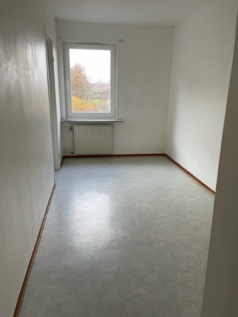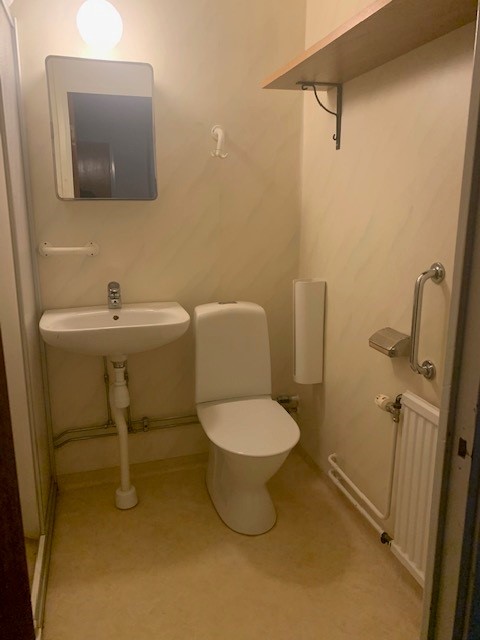 Vi kommer in i en hall med flertalet garderober. På höger hand når vi bostadens två sovrum som är ljusa med utsikt över innergård. Badrummet har plastmatta med dusch och praktiskt öppningsbart fönster som släpper in ljus. Träkök med utrymme för matplats samt spis med glaskeramikhäll. Vardagsrummet är stort och rymmer flera möblemang. I vardagsrummet finner vi även utgång till balkongen, där vi genom en grind kommer ut i markplan. Bilder i annonsen är exempelbilder på bostadens skick.
