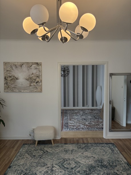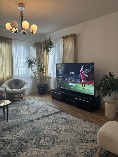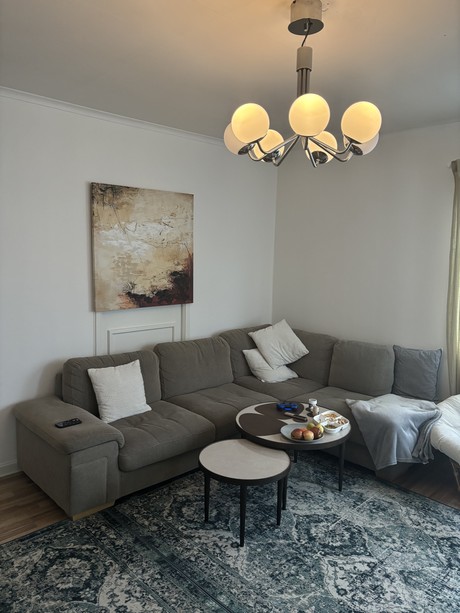 Lägenheten har ljusa väggar med golvmattor i trä-struktur. Köket har ett klickgolv i laminat. Från vardagsrummet ansluter en balkong. Badrummet är förberett för installation av tvättmaskin.