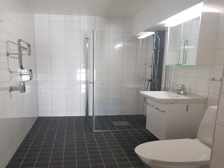 Helkaklat badrum med handfatskommod, spegelskåp, WC dusch med duschväggar, handdukstork samt förberedelse för tvättmaskin.