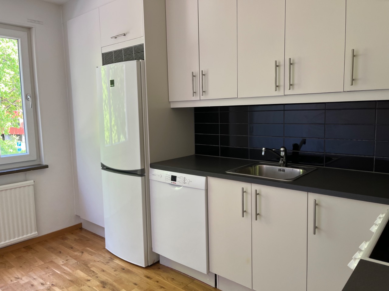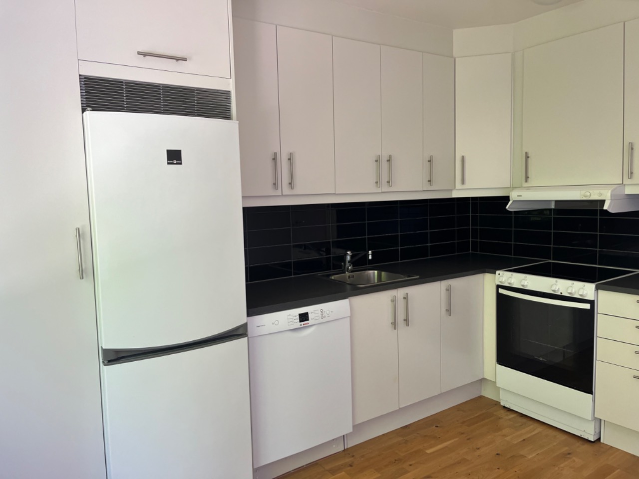 Lägenheten har ett helkaklat badrum med duschvägg och praktiskt öppningsbart fönster Köket har vita luckor och stålhandtag samt är utrustat med diskmaskin, kombinerad kyl och frys samt glaskeramikhäll med varmluftsugn. I sovrum och vardagsrum ligger parkettgolv och väggarna är ljusa. Hallen erbjuder bra förvaringsmöjligheter i garderober och vardagsrummet har utgång till en stor balkong.