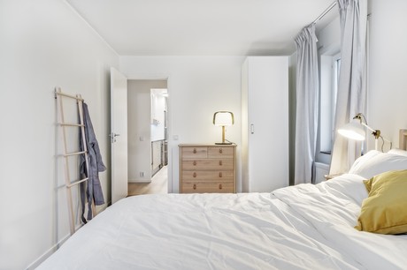 Vitmålade väggar och trälaminatgolv. Sovrummet är inrett med klädgarderob.