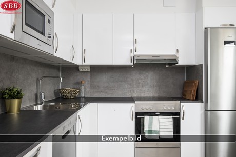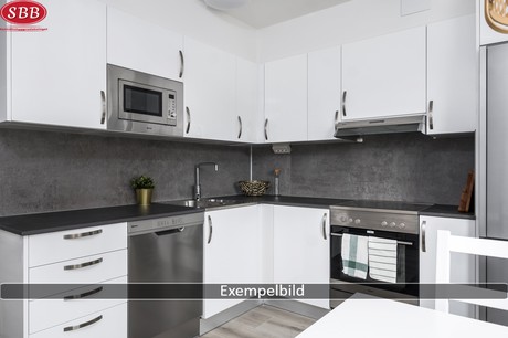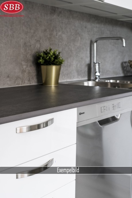Modernt kök med rostfria vitvaror, antracitgråa bänkskivor och glaskeramikhäll. Luckorna är vita med stilrena stålhandtag. Köket är utrustat med kyl/frys, ugn/häll, fläkt samt diskmaskin och integrerad mikrovågsugn.