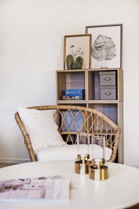Ljust vardagsrum med vitmålade väggar och trälaminatgolv.