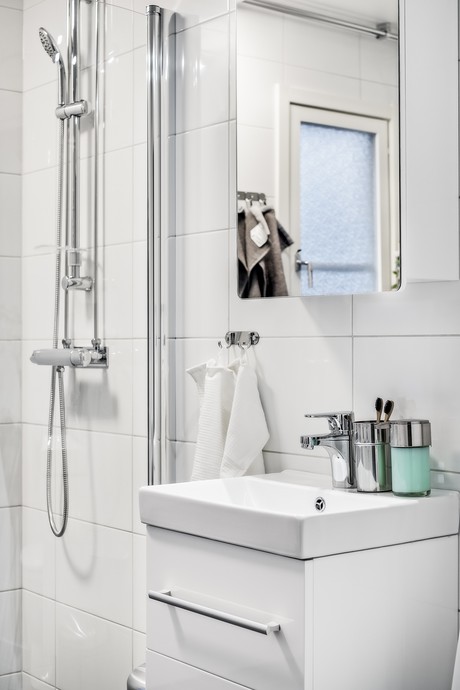 Lägenheten har ett, ljust helkaklat badrum utrustat med dusch, handdukstork, golvvärme, handfat med kommod samt spegel med belysning. I badrummet finns även kombinerad tvättmaskin och torktumlare.