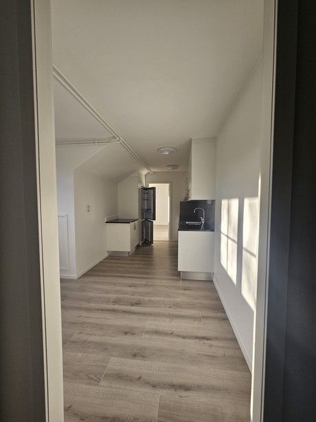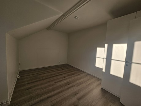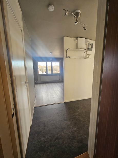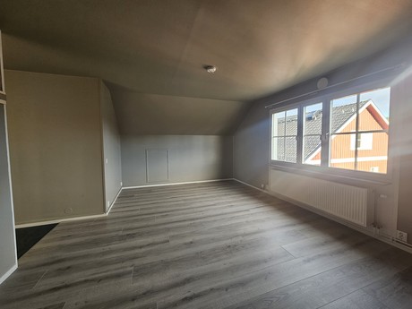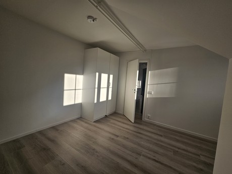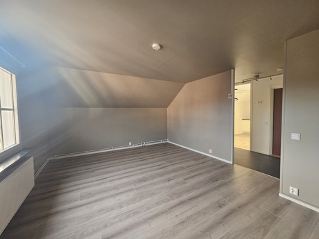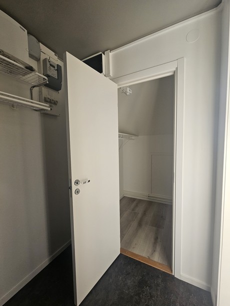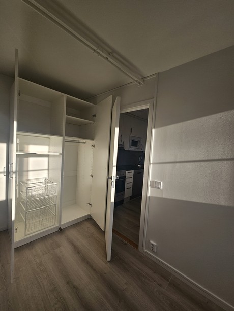 Vitmålade väggar och trälaminatgolv. Sovrummet är inrett med klädgarderob.