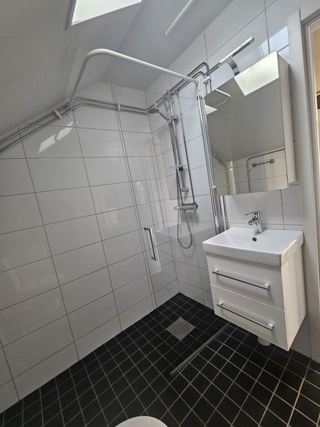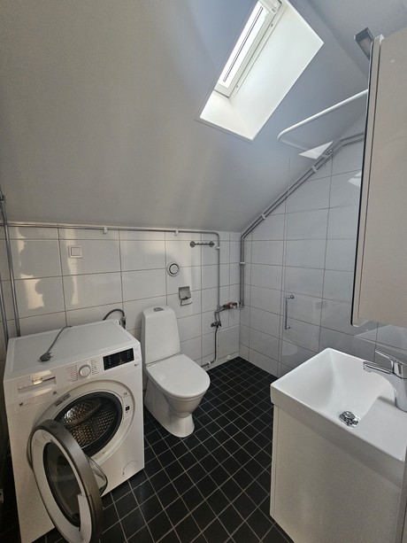 Lägenheten har ett, ljust helkaklat badrum utrustat med dusch, handdukstork, golvvärme, handfat med kommod samt spegelskåp med belysning. I badrummet finns även tvättmaskin och torktumlare.