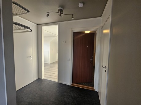 Välkomnade hall med svart entrébeläggning, vita väggar och golv i trälaminat – här finns också en klädkammare.