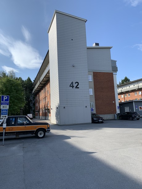 Allrummet har ljusa väggar och härifrån når du balkongen, som även har ett mindre förråd. Lägenheten har genomgående trägolv och en ljusa väggar.