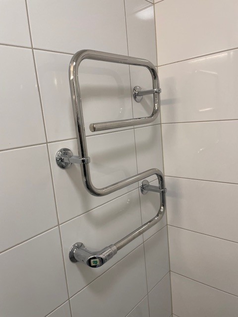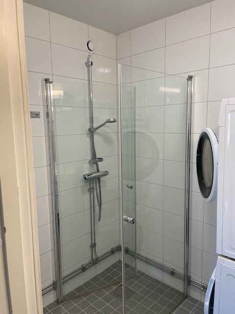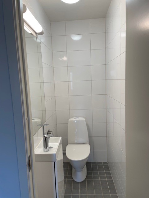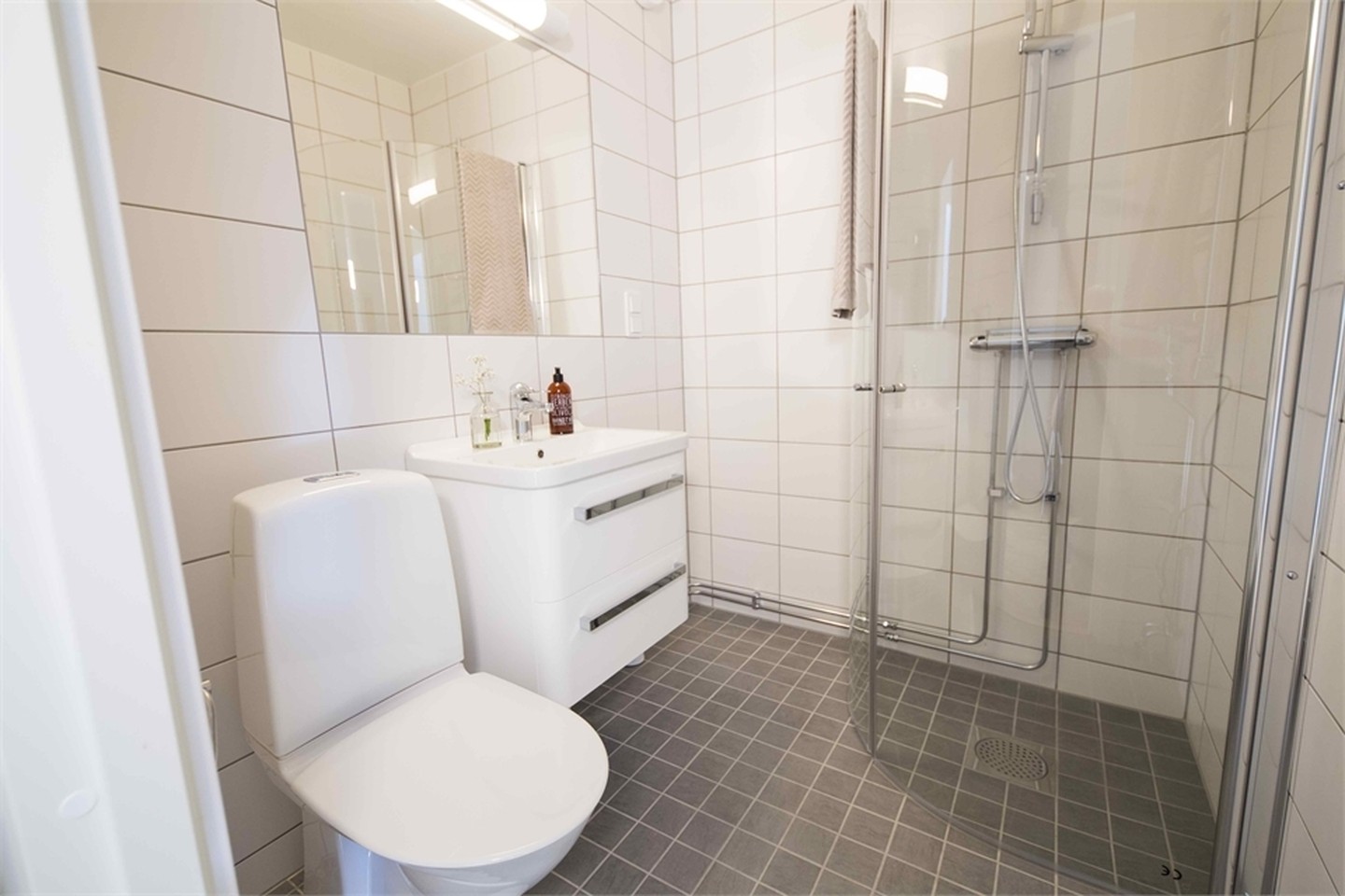 Bostaden har ett helkaklat badrum utrustat med duschväggar, handfatskommod och handdukstork som ger en stilren och funktionell känsla. Utöver detta finns även en separat WC, vilket underlättar i vardagen.