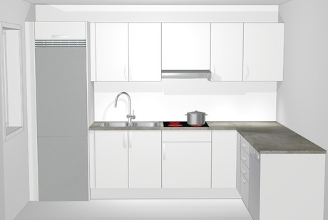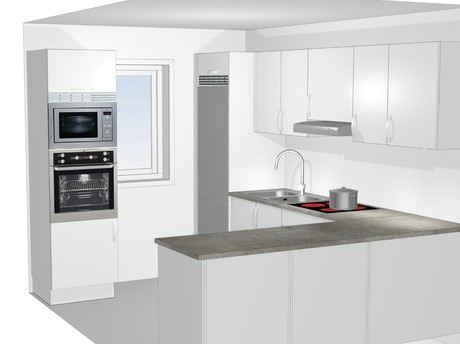 Nytt och modernt kök med rostfria vitvaror, Beige-gråa laminatbänkskivor och induktionshäll. Luckorna är vita med stilrena stålhandtag. Köket är utrustat med kyl/frys, inbygg varmluftsugn, fläkt samt diskmaskin och integrerad mikrovågsugn. Öppen och social planlösning mellan kök och vardagsrum.