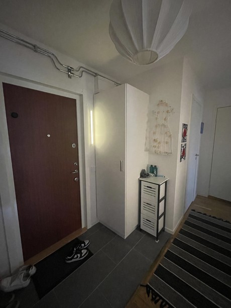 Bostaden har vitmålade väggar och ekparkett i samtliga rum, vilket ger en neutral bas som är lätt att inreda efter egen stil.