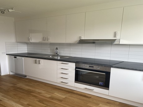I dem moderna köken finns diskmaskin, energieffektiva kyl och frysskåp, högblanka skåpsluckor och en stilren samt tålig laminatbänkskiva. I Köken finns samma vackra ekparkett som i resterande lägenheten.