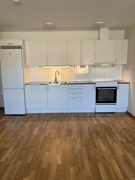 Köket är utrustat med kombinerad kyl/frys samt spis med ugn från Electrolux och det finns gott om förvaring bakom vita skåpluckor. Det är också förberett för installation av diskmaskin.