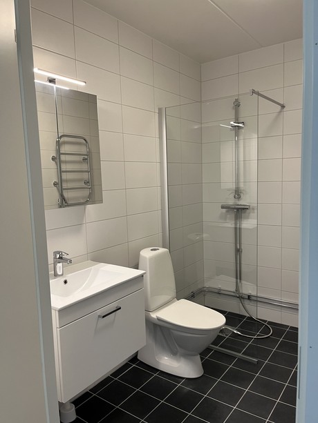 I badrummet är det svart klinker på golv, vitt kakel på väggar, dusch med glasvägg, handdukstork, tvättmaskin och torktumlare alt. kombimaskin samt handfat med kommod och spegelskåp ovan.