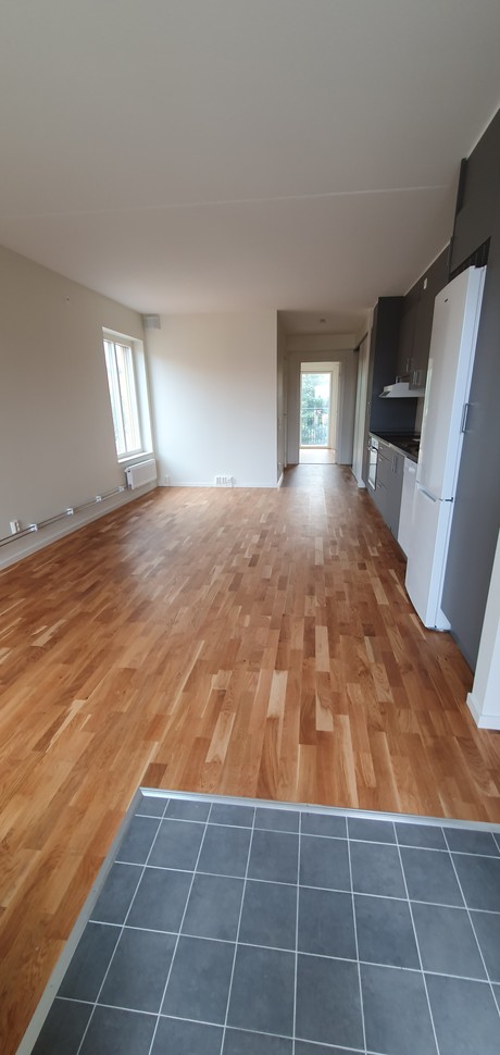 Välkomnande entréhall med grå klinker samt en garderob med skjutdörrar. Lägenheten har ett välplanerat kök från Vedum med stilrena grå luckor. Vitt kakel ovanför diskbänk. Här har du separata kyl & frys, induktionshäll & diskmaskin från Osby. Förberedd plats för egen mikro. Helkaklat badrum med grå klinker på golvet samt blankt vitt kakel på väggarna. Duschstång uppsatt vid duschen. Kombinerad maskin för tvätt & tork finns i badrummet. Lägenheten har genomgående parkettgolv och samtliga väggar är målade i vitt. I ena sovrummet finns en garderob med skjutdörrar. Förråd med skjutdörrar.