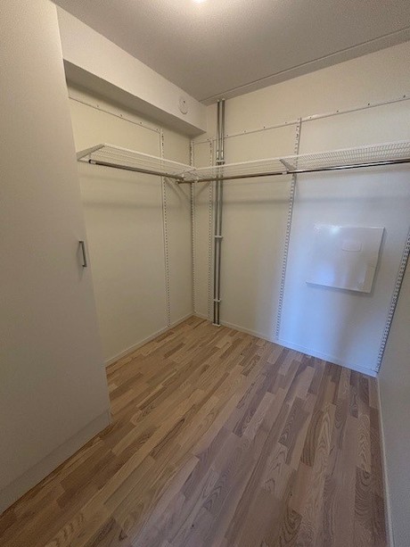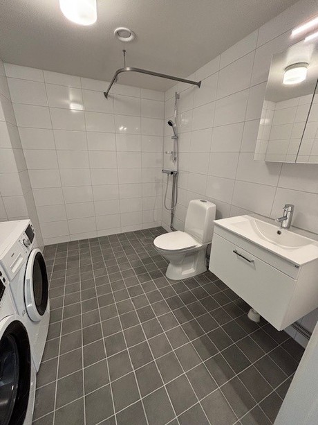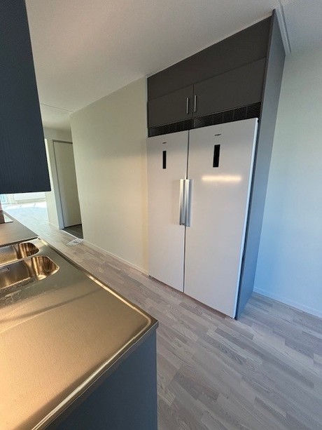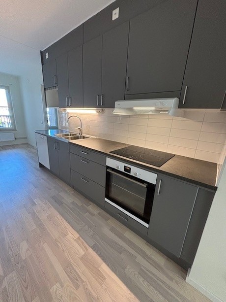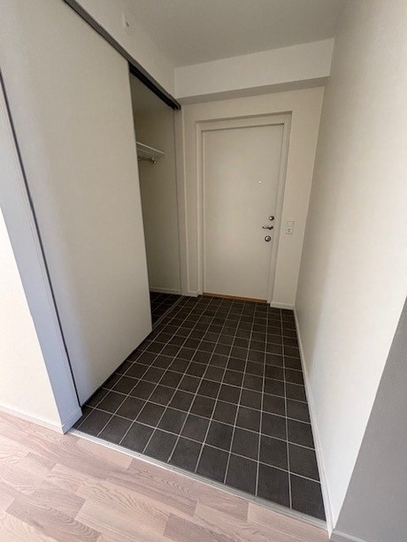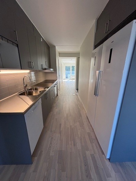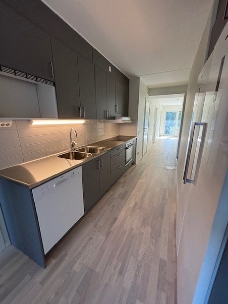 Välkomnande entréhall med grå klinker samt en garderob med skjutdörrar. Lägenheten har ett välplanerat kök från Vedum med stilrena grå luckor. Vitt kakel ovanför diskbänk. Här har du separata kyl & frys, induktionshäll & diskmaskin från Osby. Förberedd plats för egen mikro. Helkaklat badrum med grå klinker på golvet samt blankt vitt kakel på väggarna. Duschstång uppsatt vid duschen. Separata maskiner för tvätt & tork finns i badrummet. Lägenheten har genomgående parkettgolv och samtliga väggar är målade i vitt. I ena sovrummet finns en garderob med skjutdörrar. Ett förråd på 5 kvm med en städ garderob. samt ett litet sovrum på 8 kvm.