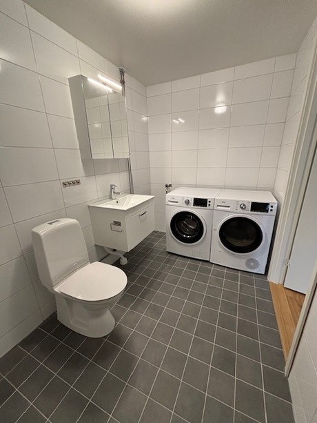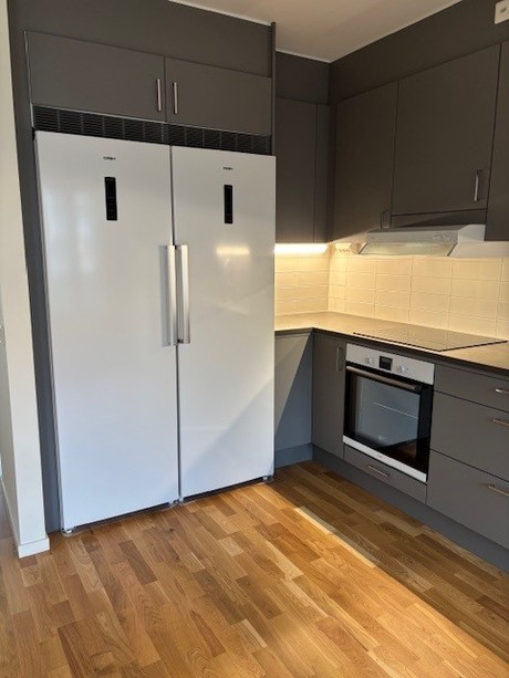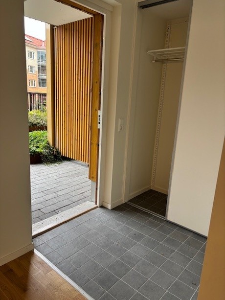 Välkomnande entréhall med grå klinker samt en garderob med skjutdörrar. Lägenheten har ett välplanerat kök från Vedum med stilrena grå luckor. Vitt kakel ovanför diskbänk. Här har du separata kyl & frys, induktionshäll & diskmaskin från Osby. Förberedd plats för egen mikro. Helkaklat badrum med grå klinker på golvet samt blankt vitt kakel på väggarna. Duschstång uppsatt vid duschen. Separata maskiner för tvätt & tork finns i badrummet. Lägenheten har genomgående parkettgolv och samtliga väggar är målade i vitt. I lilla sovrummet finns en garderob. Förråd finns i lägenheten på 6 kvm och med fönster.