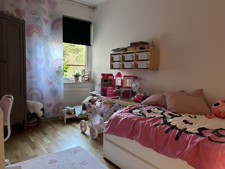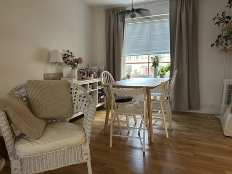 Lägenheten har fått ett genomgående parkettgolv som ger en elegant och enhetlig känsla. Väggarna är vitmålade, vilket skapar en ljus och fräsch atmosfär i hela bostaden. I sovrummet finns det gott om förvaring för att underlätta vardagen.
