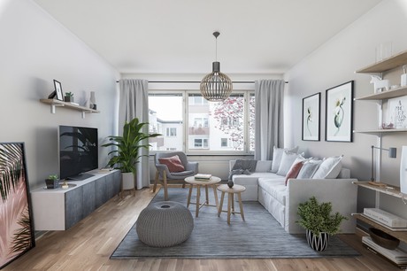 Lägenheten har fina vita väggar och nya laminatgolv i alla rum. Badrummet är helkaklat med klinker och golvvärme, duschdörrar i glas och kommod med spegel. Det finns möjlighet att lägga till tvättmaskin och torktumlare i hyran.