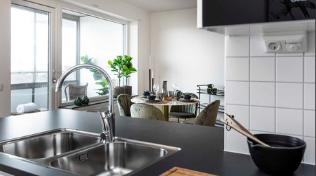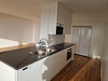 Öppen planlösning mellan kök och vardagsrum. Köket är utrustat med både diskmaskin och mikrovågsugn.