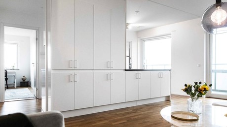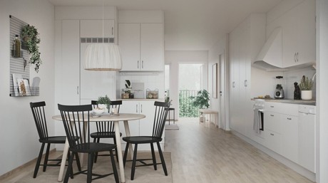 Öppen planlösning mellan kök och vardagsrum.