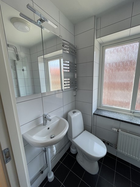 Det fräscha badrummet erbjuder dusch, vitkaklade väggar, grått klinkergolv, golvvärme och handdukstork.