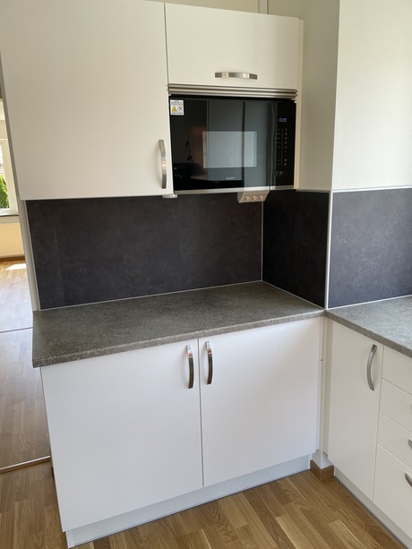 Köket är utrustat med vita luckor, grå bänkskiva samt rostfria vitvaror. Här finns även induktionshäll, diskmaskin, varmluftsugn och mikrovågsugn – perfekt för dig som vill ha ett modernt och funktionellt kök.