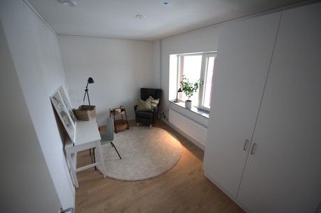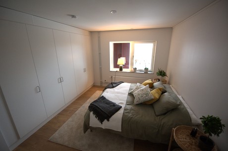 Bostaden har två trivsamma sovrum – det större med gott om plats för dubbelsäng och förvaring, det mindre fungerar lika bra som barnrum, gästrum eller arbetsplats.