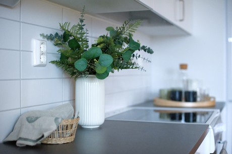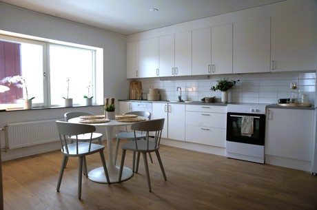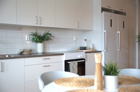 När du kliver in möts du av en ljus hall med vackert ekparkettgolv som fortsätter genom hela lägenheten. Härifrån når du hemmets hjärta – ett öppet och socialt kök i direkt anslutning till vardagsrummet. Köket är stilrent och funktionellt, med vita luckor, antracitgrå bänkskiva och blankt vitt kakel. Fullt utrustat med kyl/frys, induktionshäll, ugn, fläkt och diskmaskin.