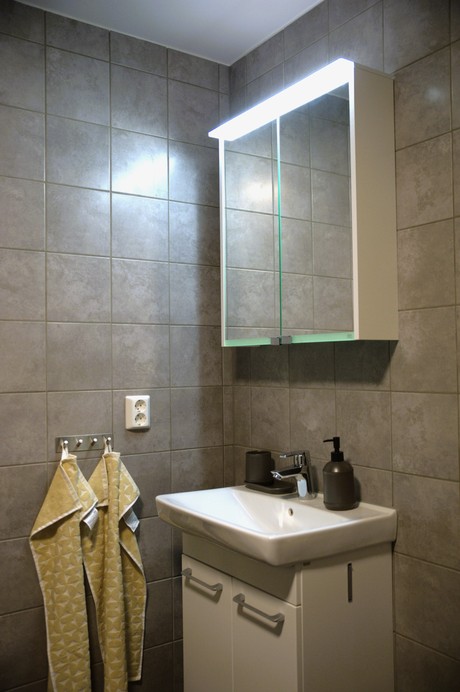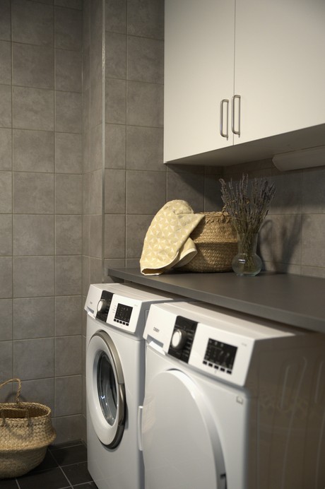 Det helkaklade badrummet har både form och funktion: dusch, wc, handfat med underskåp, överskåp och spegel – och inte minst en egen tvättmaskin och torktumlare som gör vardagen lite enklare.