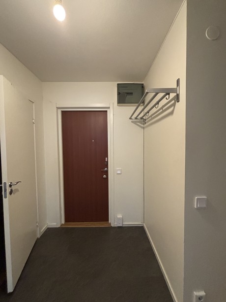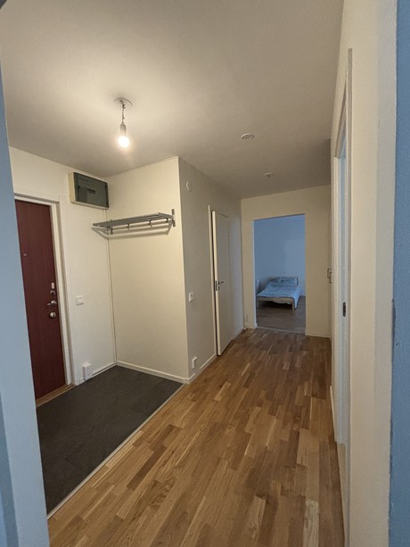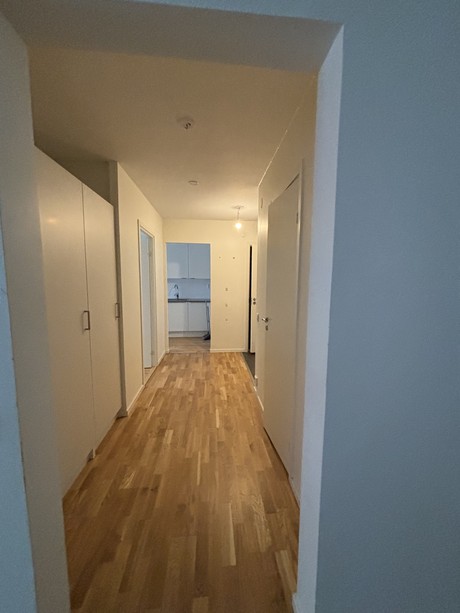 I hallen finner du gott om förvaring i form av garderober och en klädkammare. Här når vi även lägenhetens helkaklade badrum med duschväggar, handdukstork samt förberett för tvättmaskin.