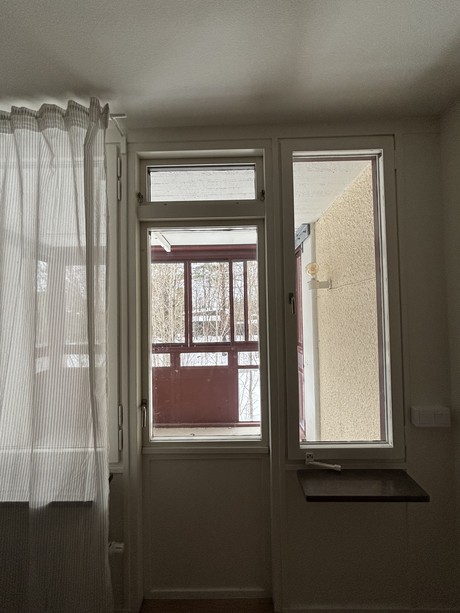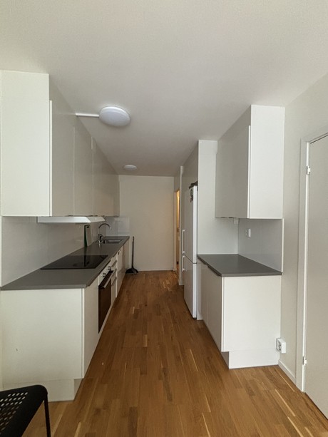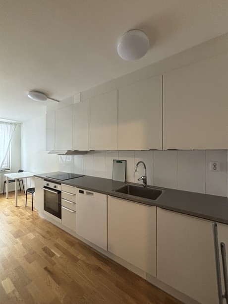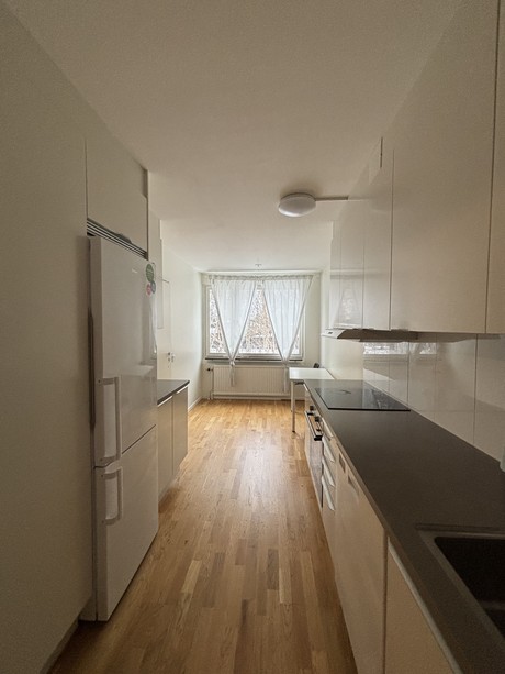 Köket är ljust och modernt och är utrustat med induktionshäll, diskmaskin och rymmer en större matplats. Vardagsrum har parkettgolv med vitmålade väggar. I anslutning till vardagsrummet finns det en inglasad balkong.
