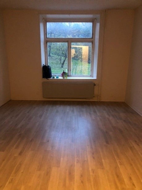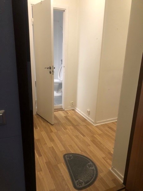 Rymligt allrum med parkettgolv. Badrummet har kakel och klinkers och är anpassat för installation av tvättmaskin. Lägenheten har ett rymligt kök och goda förvaringsmöjligheter.