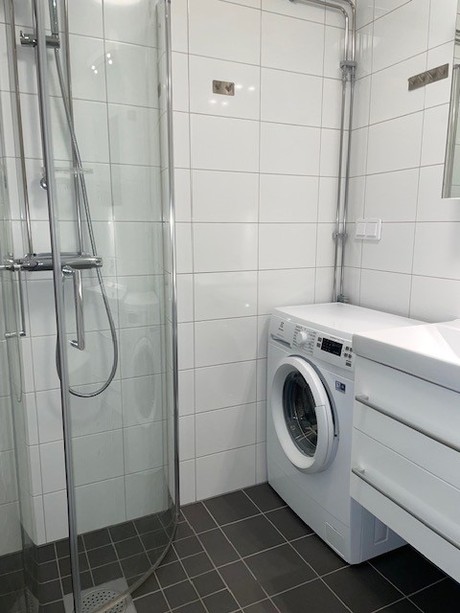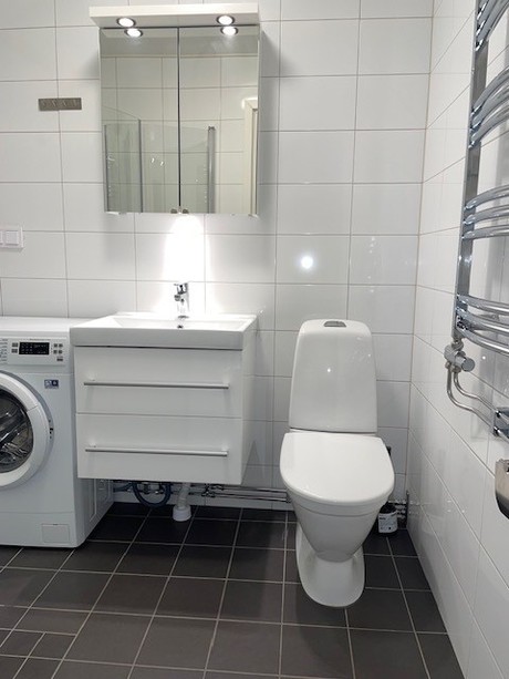 Lägenheten har ekparkett genomgående och badrummet är helkaklat med golvvärme, tvättmaskin och handukstork. Köket är rustat med diskmaskin och mikro. Samtliga tak och väggar är målade i en ljus neutral färg.