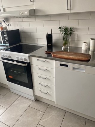 Lägenheten renoverades för fem år sedan och fick du ett nytt kök och nytt badrum förutom att alla väggar putsades vita.