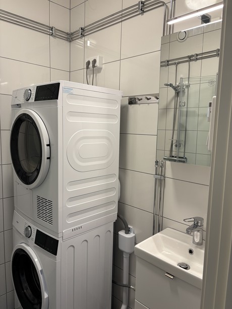 Lägenheten är genomgående vitmålad med parkettgolv. Badrummet är stilfullt inrett med kakel och klinkers samt duschdörrar i glas. Dessutom är badrummet utrustat med tvättmaskin, torktumlare, handdukstork och golvvärme. Köket är utrustat med moderna vitvaror som induktionshäll, diskmaskin och inbyggd varmlufts- och mikrovågsugn. I anslutning till hallen finns en rymlig klädkammare.