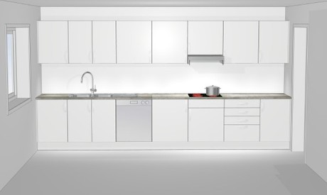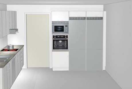 Nytt och modernt kök med rostfria vitvaror, Beige-gråa laminatbänkskivor och induktionshäll. Luckorna är vita med stilrena stålhandtag. Köket är utrustat med kyl/frys, inbygg varmluftsugn, fläkt samt diskmaskin och integrerad mikrovågsugn.