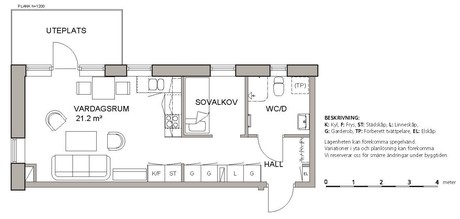 Ljus och välplanerad 1 rok med moderna materialval. Lägenheten har vita väggar och ett öppet vardagsrum med kök i anslutning till en trivsam uteplats. Det lilla sovrummet är målat i en ljusgrå ton och ger en mysig och ombonad känsla. Badrummet har vitt/ grått kaklade väggar och plastmatta i grå nyans, utrustat med egen tvättmaskin. Uteplats med utgång från vardagsrum. En perfekt bostad för dig som söker ett stilrent och lättskött hem.